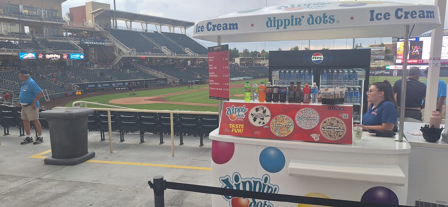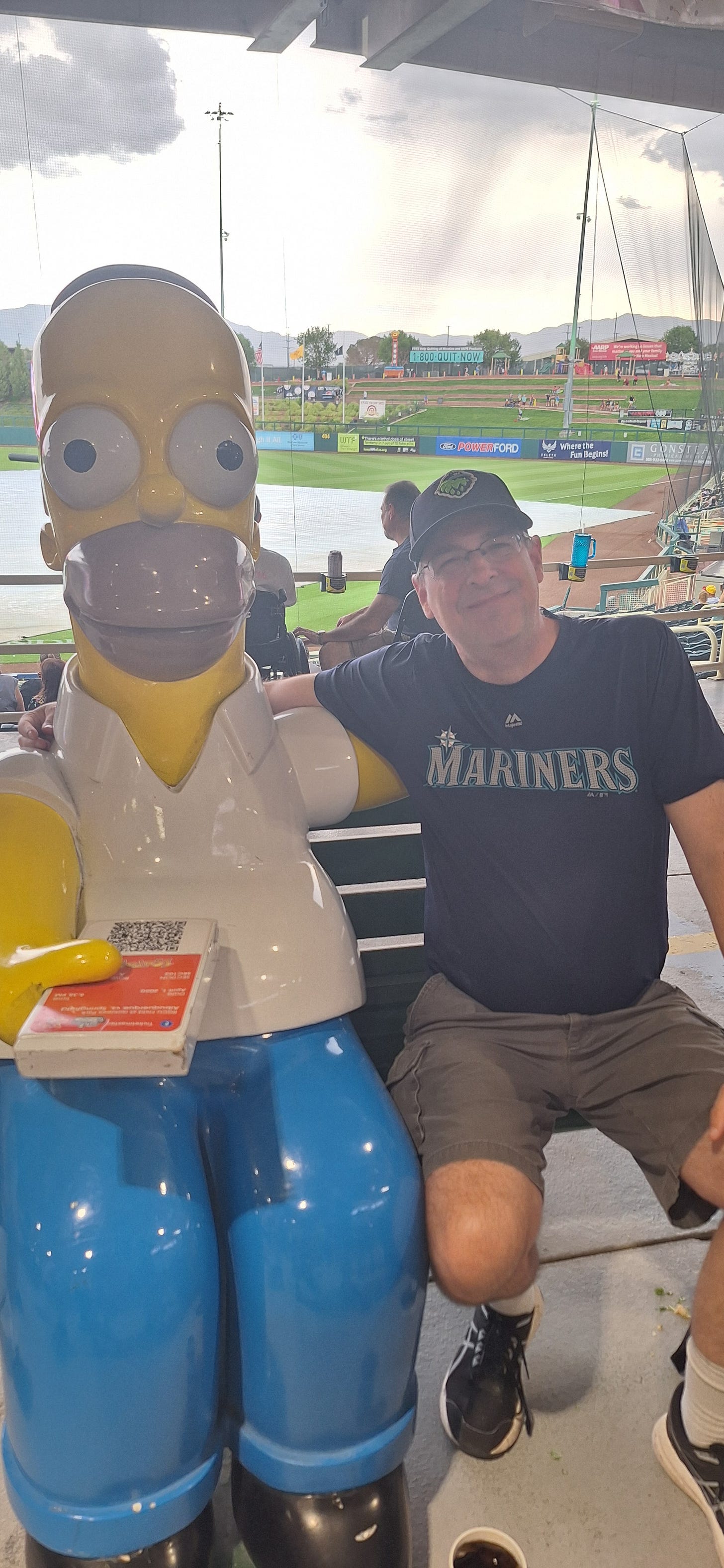 Because it was a lovely evening. The first night, we had to wait out a ubiquitous evening thunderstorm. Even though the place was packed, we were all able to gather under the stands with some degree of comfort. Some stood and ate the wonderful food, and some sat next to a Simpson. While there, I noticed that Albuquerque is the absolute Platonic ideal of a pavilion area. There are options for food and tons of places to buy Isotope swag, but from every vantage point, I could see the field. So when I go off to get my pig candy or a Dr Pepper, it’s very easy to keep track of the ballgame.