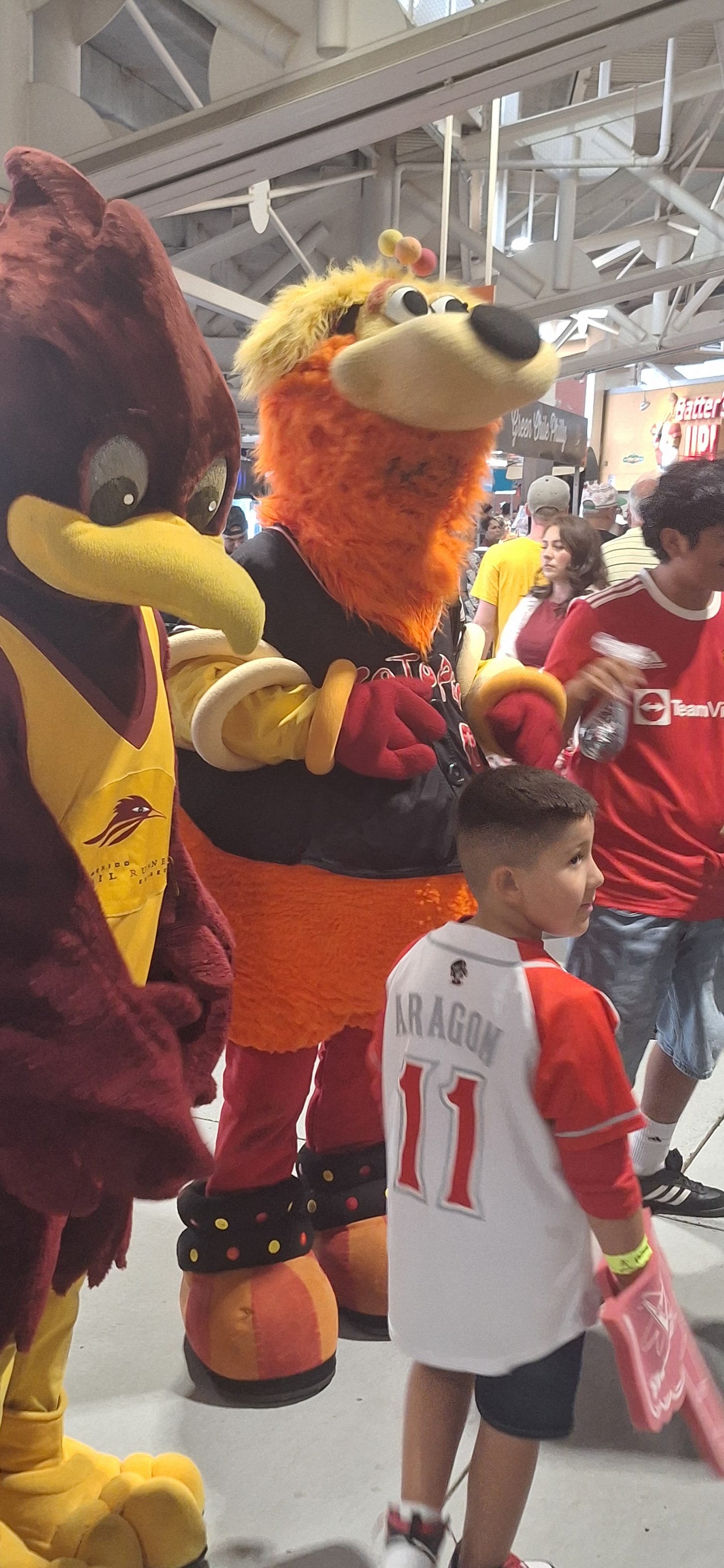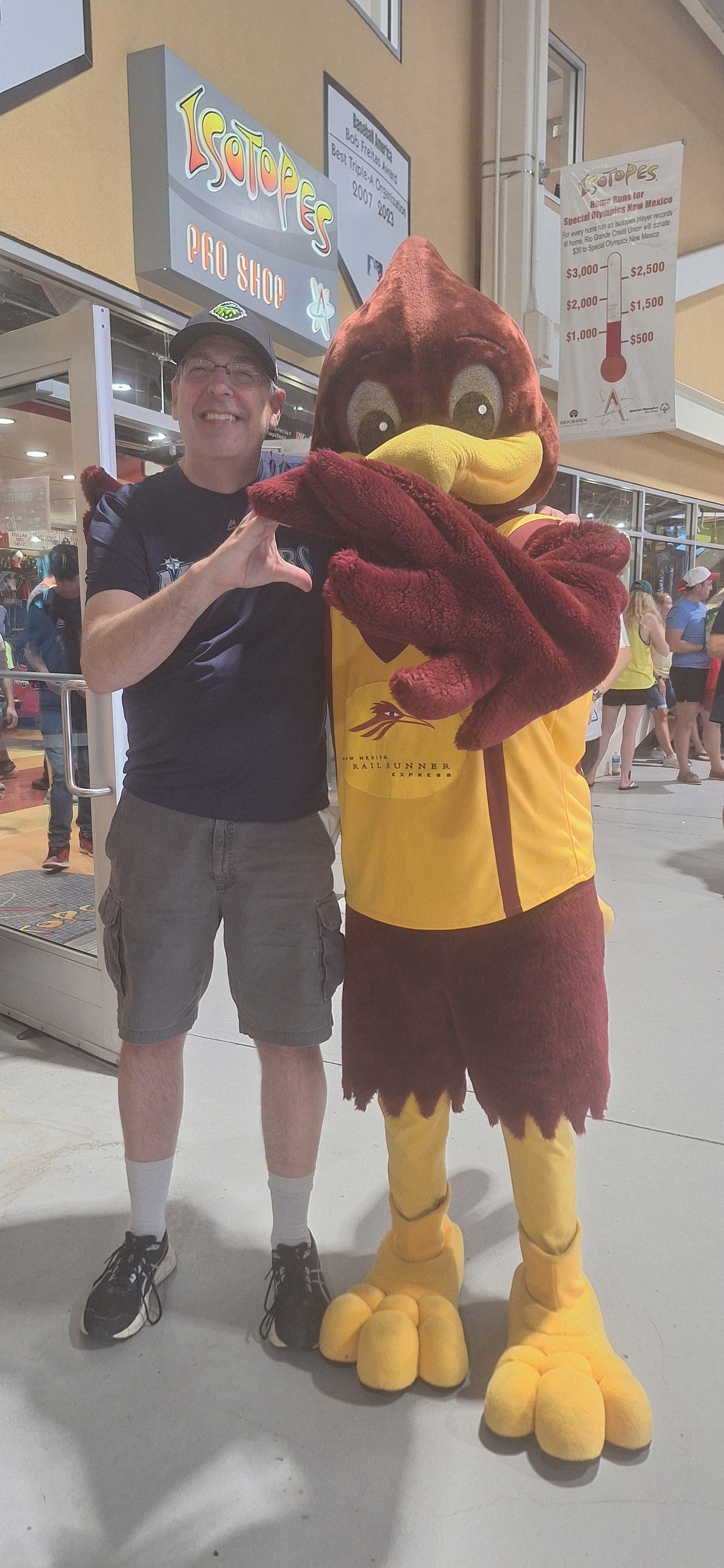 Orbit above. Trax, the mascot of the New Mexico Rail Runner Express (I suppose it’s a roadrunner), below. The legend of “Isotopes” is interesting. “Orbit” works with the name, and I think Trax and I hit it off pretty well.
