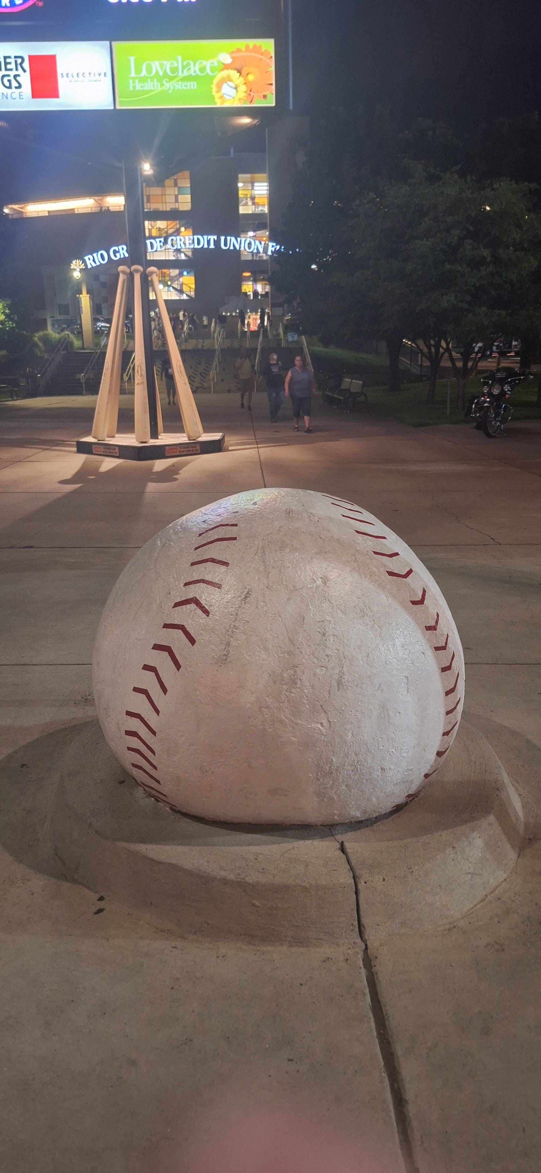 I heard the legend of Isotopes ballpark: it was renovated recently after city residents turned down a tax for a new ballpark. “Renovated” is key–at least according to the version I heard, the only thing kept from the old place was an oblongish baseball sculpture not far from the entrance. This would be like saying we “renovated” my house when we knocked the whole thing down and rebuilt it around my nightstand, which would remain.