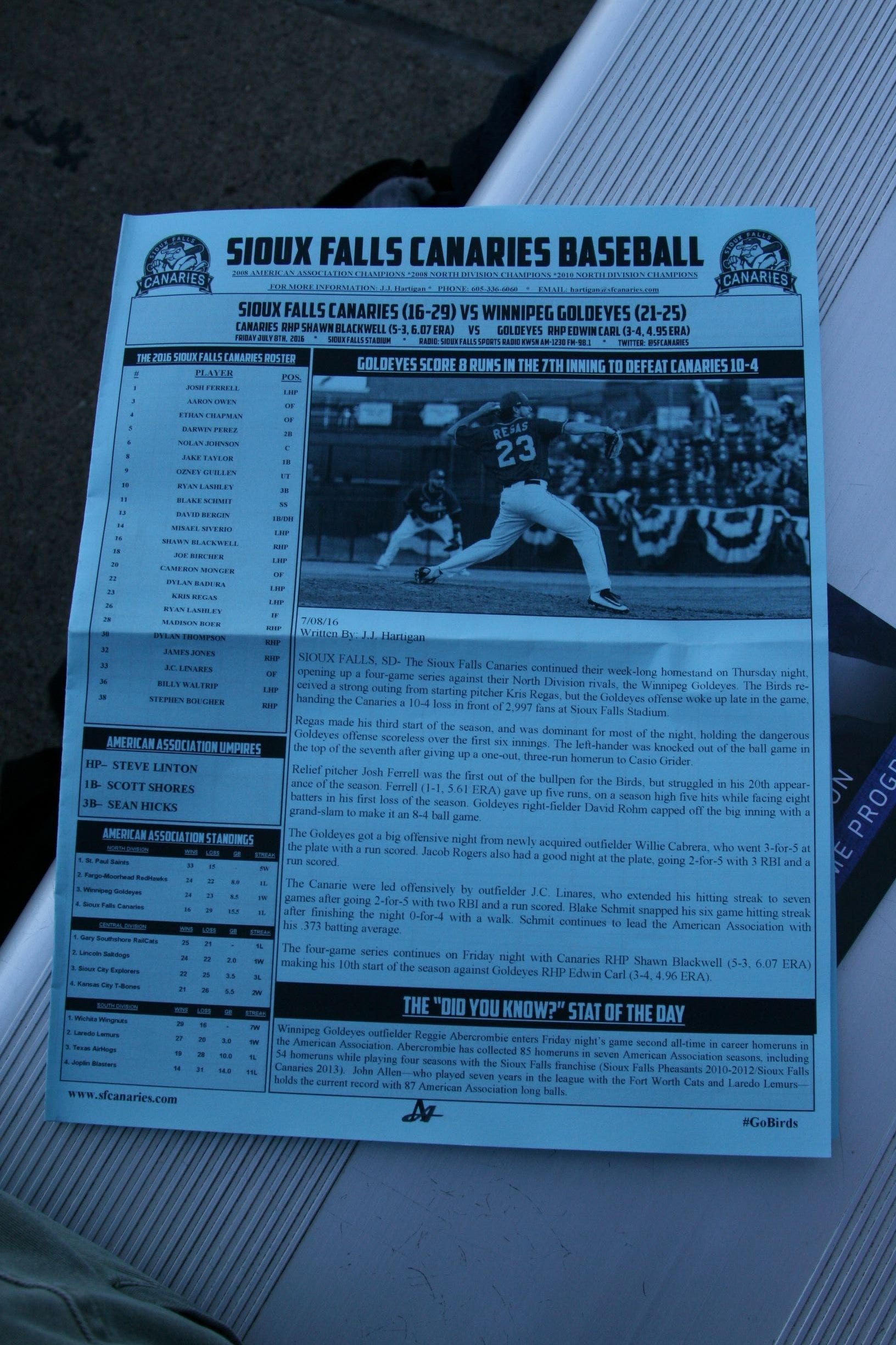 First game: July 8, 2016 (Sioux Falls Canaries 18, Winnipeg Goldeyes 9)